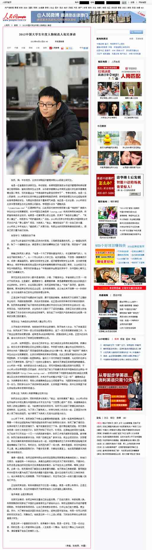 2012年,他带领团队,结合自己所学专业,致力食品安全和有机食品领域,拼搏创业,担任北京华夏绿源生态农业有限公司副总,并积极为残疾人事业作出应有的努力。其所创办的“酒魅优品”项目曾经获得全国MBA创业大赛十佳,第七届“挑战杯”首都大学生创业计划竞赛银奖、3044永利官网vip首页欢迎您特别奖等多项荣誉。在此之前张民曾成功创办过咿呀团购网,作为中国第一批团购网站,曾在三个月内突破百万销售额,与此同时也参与创办了天津拼客网,因产生了一定的社会影响力,曾担任天津地区滨海频道特邀嘉宾。2012年的一年里,他积极走访各大食品企业,探究中国食品问题出现的内在原因,于2012年10月份带领团队日夜奋战,成功打造了致力于做最负责任的中国食品安全网站-中国生态食品网,该项目获得了中国绿色食品有机食品北京展销以及3044永利官网vip首页欢迎您领导的高度好评。未来该平台将整合中国“三证一标” 健康食品企业,为消费者和负责任、有良心的健康食品企业之间搭建平台,为国家的食品安全问题尽一份力。同时参与创办了尚优特有机食品网、北京菜篮子等网站,其中北京菜篮子被北京电视台等多家媒体报道过。