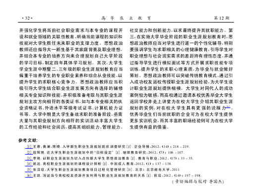 第三,借鉴CCSS 成功的深阶分析方法,提出具有导向性的对策建议。CCSS 活动的成功之处不仅在于揭示不同类型高校教育教学过程性现状,更重视对产生问题原因的深度挖掘和对策分析。根据都市型现代农业办学特色和培养目标定位,基于学校本科生学习投入和学习发展现状和存在差距,课题研究组向学校提出了应充分借鉴国内外高校先进的教育管理制度,进一步推进学分制建设; 努力提高教师教学能力,强化教学的过程性管理,重点强调“以学为中心”的课程设计,坚持双向互动的教学方法,深化对学生学习的“形成性评价”;加大改革力度,完善“以学生学习收获”为目标的考评体系等一系列有针对性的对策建议。并强化学生将当前社会职业需求与本专业的课程开设和就业领域的关联性教育,明确当前课程的知识和技能对大学生胜任未来职业的支撑力度。思想政治教师还应指导大一新生基于其家庭背景及职业理想,并结合本专业的培养方向来合理规划自己大学阶段的学习目标,制定四年具体学习规划。其次,大学生学业生涯中期暨二、三年级的职业生涯规划教育应当偏重于培养学生的专业职业素养和综合从业技能,以提升学生的求职核心竞争力。思想政治教师应当积极引导大学生结合职业生涯发展方向有选择的辅修相关专业知识和技能,并积极准备考取与其职业生涯规划主攻方向相符的各类证书,如与本专业相关的执业资格证书、外语水平等级考试证书、计算机能力证书等。大学中期是大学生备战求职的准备阶段,亟需大量与其职业规划方向相符的实训活动丰富大学生的工作经验和社会阅历,提高其组织能力、管理能力、社交能力和创新能力,以求最终提升其就职能力。第三,在实施大学毕业阶段的职业生涯规划教育时,思想政治教师应当对学生进行逐一的个性化辅导,特别要强调学生与求职相关的心理健康教育,引导学生对职业理想与社会现实需求的差距持有理性态度,并通过指导学生进行模拟面试等方式开展求职技能专项训练,提升学生的求职心理素质,为毕业与就业做好筹划。思想政治教师可以突破传统教育模式,通过引入成功校友返校传授职业生涯规划经验,为大学生设计职业生涯规划提供楷模。大学生对同代人的成功案例较为敏感,而高校通过邀请本校优秀毕业大学生返回学校并走上讲堂为在校大学生介绍其职业生涯规划的实例,对在校大学生具有更强的说服力。优秀毕业生们当前就职的企业可为在校大学生提供更多实训机会,而其丰富的职场经验则可为在校大学生提供有益的借鉴。