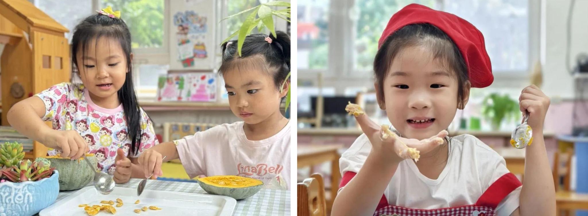 南瓜糕是丰台区第一幼儿园小朋友们非常爱吃的主食之一,它不但美味,而且营养价值非常高。秋天的南瓜正值时令,孩子们在幼儿园动手制作南瓜糕,用勺子先挖出南瓜的籽,送到食堂,等待南瓜蒸软。挖出的南瓜籽也激发了孩子们的好奇心,他们分别数一数每个南瓜里面到底有多少籽?并把它们晾晒起来。制作南瓜糕的过程中,孩子们的兴趣非常高涨,他们使出浑身解数,搓一搓、揉一揉,压一压、捏一捏,金黄色的面团在孩子们的手中变化,然后揉成团,放入红枣,南瓜糕就做好啦。