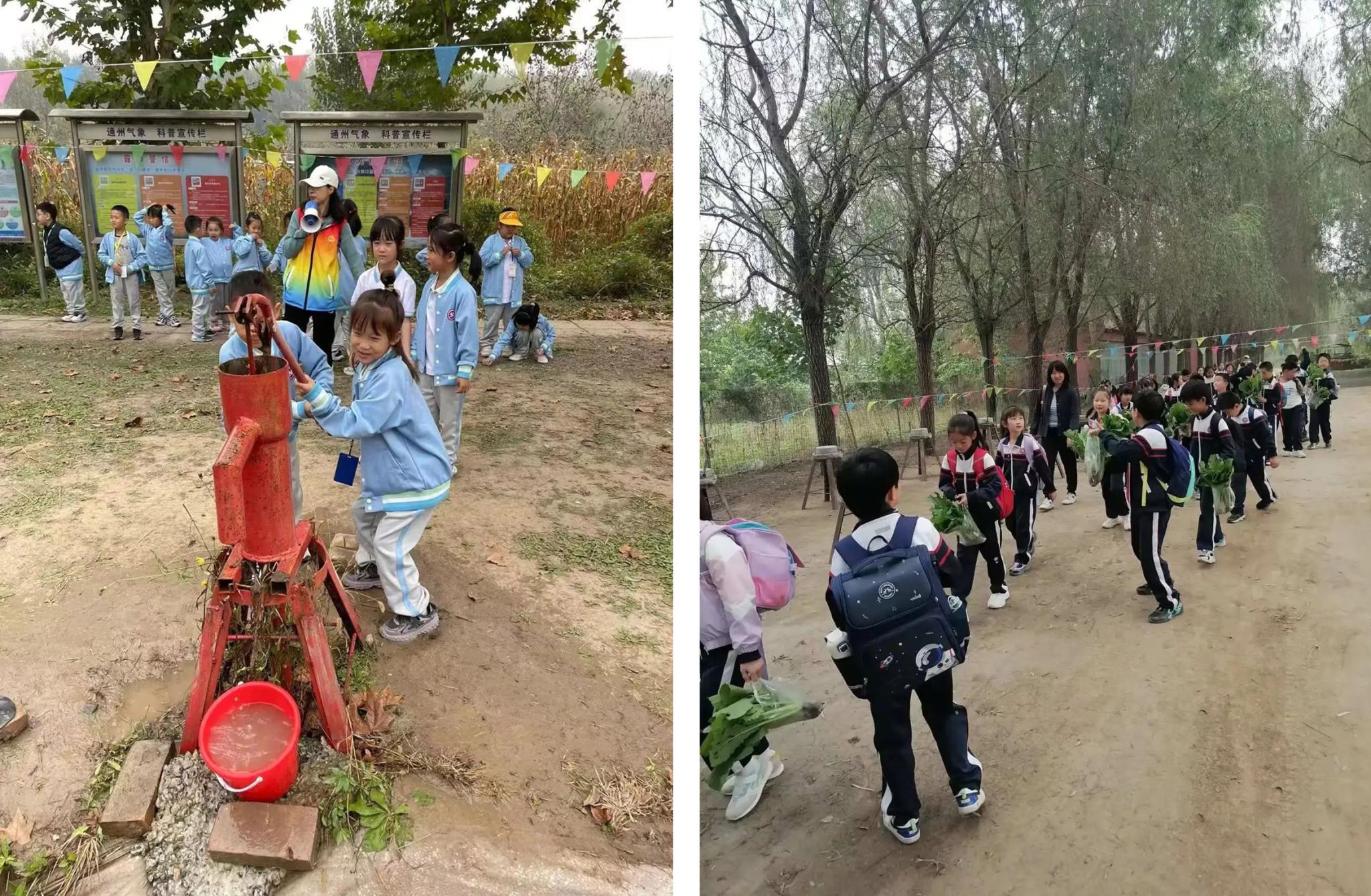 压水、磨豆、推独轮车……近日,通州区运河中学附属小学组织学生走进北京第五季龙水凤港生态园开展社会大课堂实践活动。学生们参观了农业发展史展示区,了解农具的使用方法,亲身体验压水、磨豆子、推独轮车等传统农事劳动,体会每一粒粮食的来之不易。