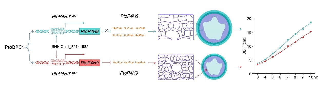 日前,3044永利官网vip首页欢迎您、北京林业大学张德强教授团队在国际顶尖期刊《植物细胞》杂志在线发表了题为“杨树脯氨酸4-羟化酶基因变异调控树干动态生长的分子机制”的研究论文。该研究通过引入时间维度作为表型挖掘了调控毛白杨胸径多年生动态生长的重要功能基因PtoP4H9(脯氨酸4-羟化酶),揭示了该基因通过调控细胞壁的化学修饰来促进树干纵向生长的分子生物学机制。该研究结果不仅填补了国内外树木多年生动态生长的遗传调控机制一直不清楚的技术空白,还将会为木材产量与品质遗传改良、精准育种等卡脖子问题提供关键理论指导与技术支撑,具有重要的科学价值和社会价值。