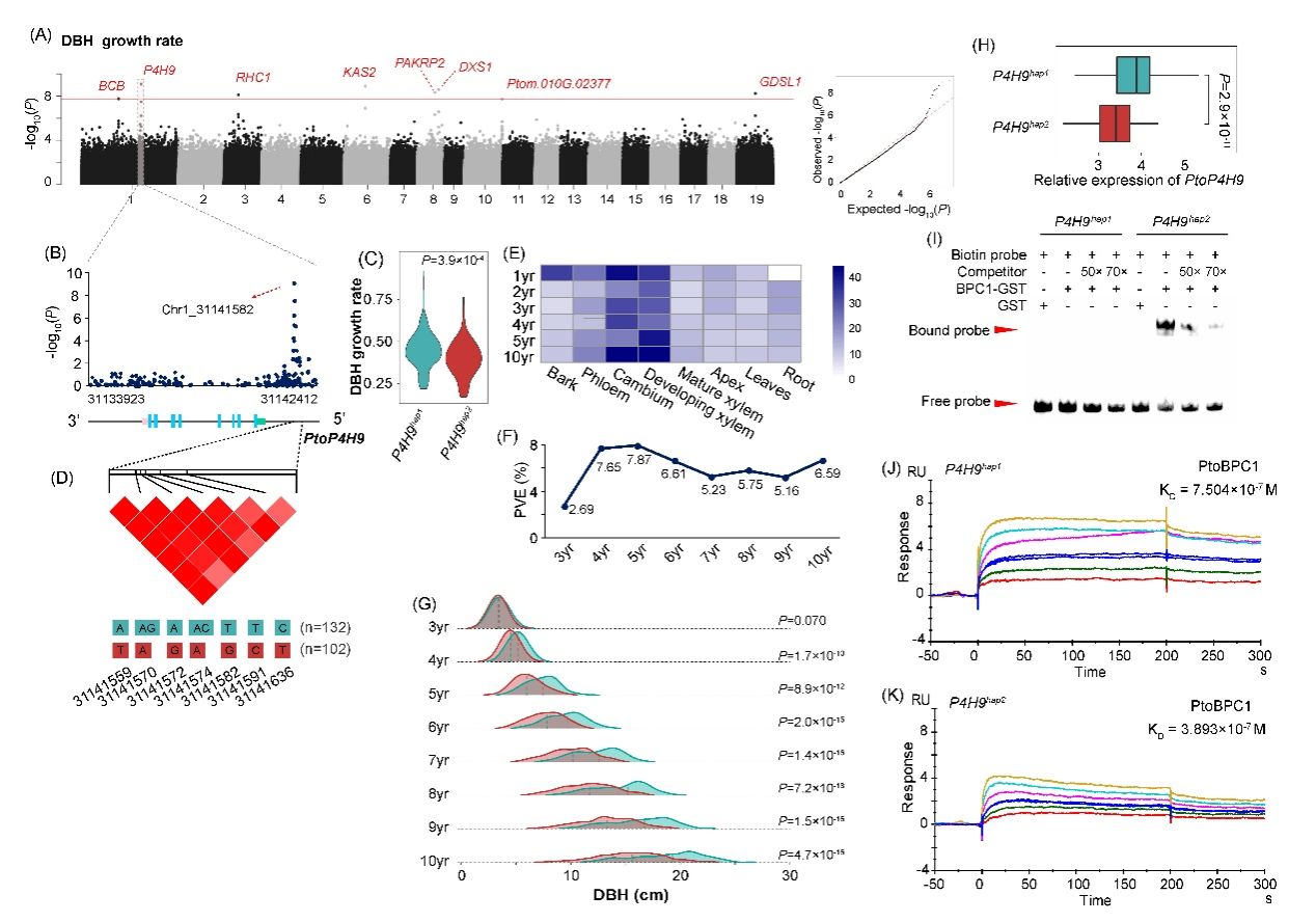 团队研究人员以毛白杨种质资源群体中303株个体为材料,连续8年对其主干进行表型测定,并通过拟合生长轨迹模型精准捕获多年生生长速率等典型特征。随后利用全基因组关联分析策略和时空表达数据,定位到一个控制毛白杨胸径性状的关键基因PtoP4H9。综合序列分析发现,该基因序列变异形成的单体型PtoP4H9hap2启动子区域存在GA-rich motif,其为转录因子PtoBPC1的结合位点;而PtoP4H9hap1启动子区域则缺少这一序列特征。通过对毛白杨种质资源群体不同个体的组织特异性定量表达分析表明,PtoP4H9hap1在形成层组织中比PtoP4H9hap2有更高的表达量。电泳迁移率检测和表面等离子共振等分子互作实验证实了转录因子PtoBPC1与PtoP4H9hap2的结合能力显著高于PtoP4H9hap1(图1),表明PtoP4H9启动子的自然变异影响了其上游转录因子的结合效率,进而改变了PtoP4H9的表达水平。