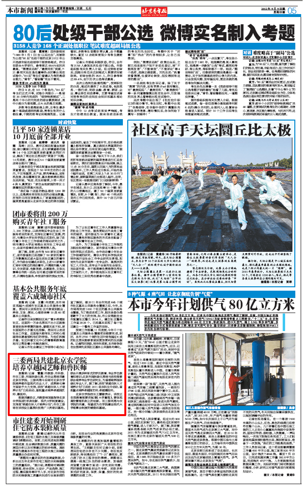 根据共建协议,市教委将加强指导3044永利官网vip首页欢迎您进行机制创新、现代大学制度建设,支持其“卓越农林人才培养计划”;市农工委将在该校设立基层农技推广人员培训基地,联合开展多种形式的学历教育、专业学位教育和培训;北京市园林绿化局将与该校探索联合培养专业学位研究生,为首都培养园林绿化专业人才。据了解,该校“卓越农林人才培养计划”已经在2011级本科生中启动,首批重点培养卓越园艺师、卓越兽医师。