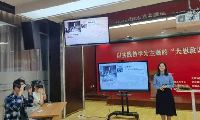 记者注意到,在这堂“大思政课”上,老师利用了多种方式讲解内容。比如,为了让同学们感受1949年2月3日中国人民解放军进入北平时受到百姓夹道欢迎的盛况,现场准备了VR眼镜。在讲解共产党人“赶考路”时,使用了沙画视频。