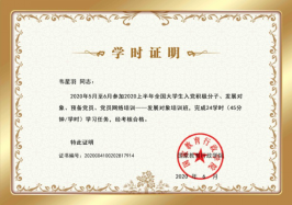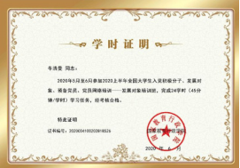参训学员围绕“厚植爱国主义情怀 争做新时代学生楷模”这一主题撰写了800 字的思想汇报。学员卞思宇写到:“作为一名入党积极分子,我更应该争做新时代的学生楷模,在日常的生活学习中给其他同学做出表率,努力学习专业技能,为建设祖国做好知识储备。”学员王晨航写到:“作为新时代的学生,我要积极听从党的领导,认真贯彻党的精神,向优秀的党员前辈们学习,努力争取做未来学生群众的学习榜样与楷模。我一定坚定沿着党的指导路线前进,不忘初心、牢记使命、不懈奋斗,并延续中国共产党员的优秀精神,尽快成为一名合格的中国共产党员。”学员覃佳琳写到:“在今后的学习中,我将以这次党课学习为契机,不断加强自己的政治理论学习,提高自己的政治觉悟、思想水平,努力钻研专业知识,尽自己所能帮助身边的人,同时以集体利益为重,以人民利益为重。肩负起自己的责任与义务,成为更加优秀的自己,并勇于积极自觉地接受党的教育和考察。”在最后的考试环节,参训学员通过45分钟的在线测试,对学习成果进行验收验证,并顺利拿到了学校党委党校颁发的结业证书,圆满完成了此次教育培训任务。