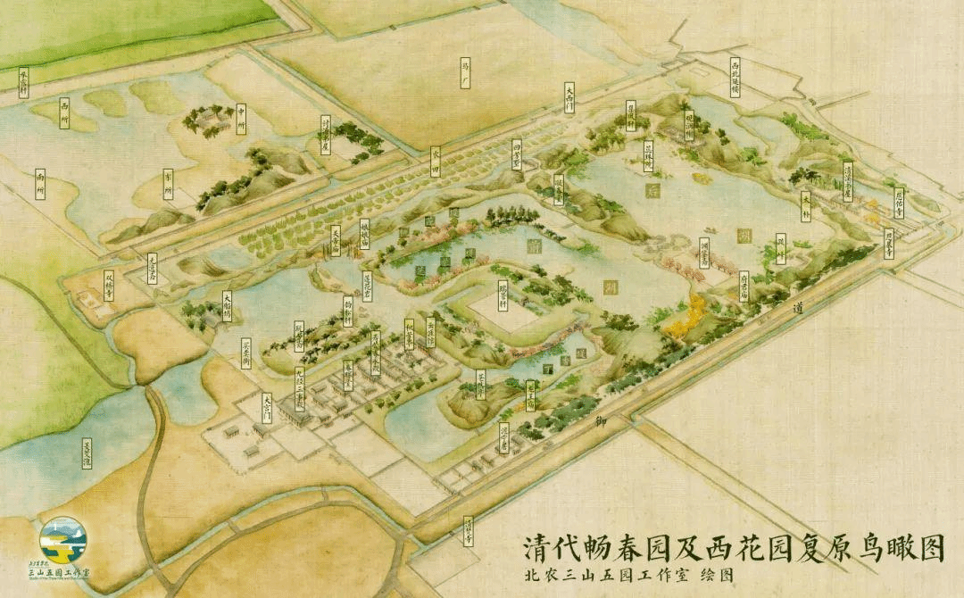 畅春园始建于清康熙二十三年(1684年),是康熙帝在明代李伟的清华园旧址基础上改建而成的。 其西侧新建有专供皇子居住的附属园林西花园,两园总占地面积约87万平方米,比紫禁城还多出了15万平方米。畅春园地处“三山五园”的门户地带,也是距离海淀镇最近的一座皇家园林。在园林风格上,畅春园依托海淀的湿地环境打造,自南至北引入万泉河之水来形成多样水景,属于集锦式山水园,设计水准高超。园中植物品种繁多,景致丰富,一年四季生机勃勃、如诗如画。皇帝在园内的澹宁居接见大臣,在渊鉴斋、佩文斋组织编纂《渊鉴类函》《佩文韵府》等书籍,在蒙养斋跟随传教士钻研西方科学技术……治国之道在此彰显,中西文明在此对话,使得畅春园又具有了深刻的文化意义。