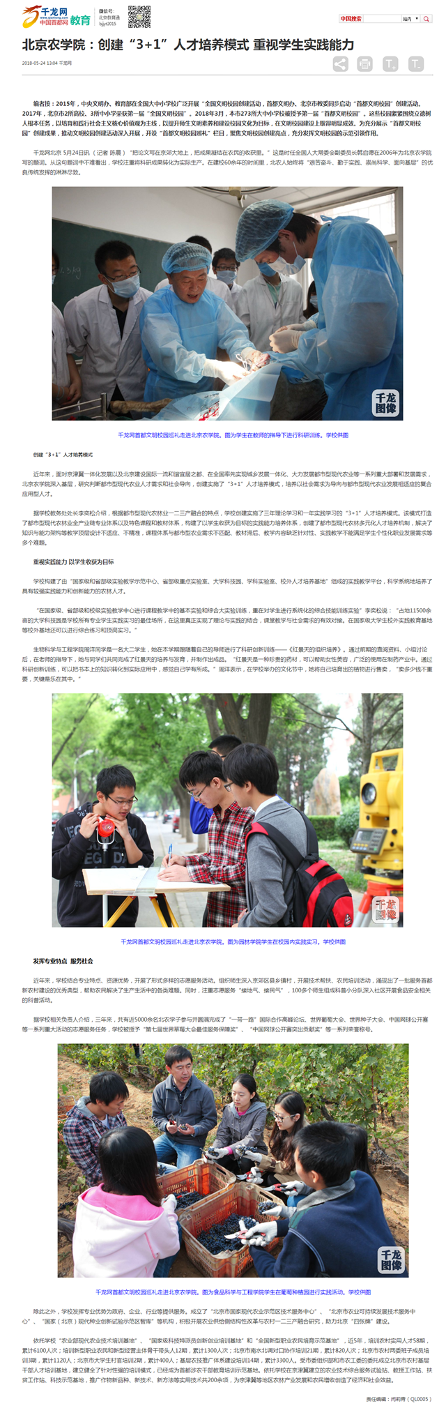 近年来,面对京津冀一体化发展以及北京建设国际一流和谐宜居之都、在全国率先实现城乡发展一体化、大力发展都市型现代农业等一系列重大部署和发展需求,3044永利官网vip首页欢迎您深入基层,研究判断都市型现代农业人才需求和社会导向,创建实施了“3+1”人才培养模式,培养以社会需求为导向与都市型现代农业发展相适应的复合应用型人才。