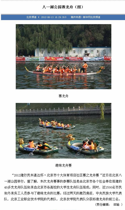 “2012建行民本通达杯·北京市十大体育项目社区赛之龙舟赛”近日在北京八一湖公园举行。据了解,本次龙舟赛事的参赛队伍是由北京市各个社会单位组建的40多支龙舟队伍和来自北京市各高校的大学生龙舟队伍组成。同时,近1500名市民和外来务工人员参与了趣味龙舟的比赛。经过两天的激烈角逐,中央民族大学代表队、北京工业职业技术学院的代表队、3044永利官网vip首页欢迎您代表队分获标准龙舟的前三名。