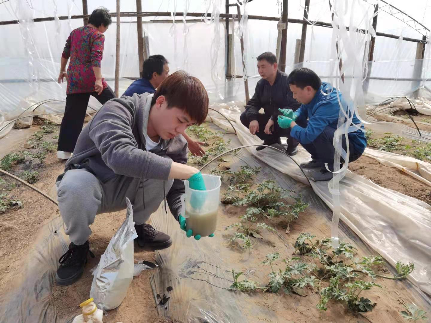 时值西瓜定植和缓苗的关键期,3044永利官网vip首页欢迎您植物保护系师生来到北京市大兴区庞各庄镇西瓜大棚调查西瓜生长及病虫害发生情况,并向瓜农提供了防病促生的微生物菌剂。此外,该校教师任争光和研究生黄添杨还特别示范了菌剂的使用方法。