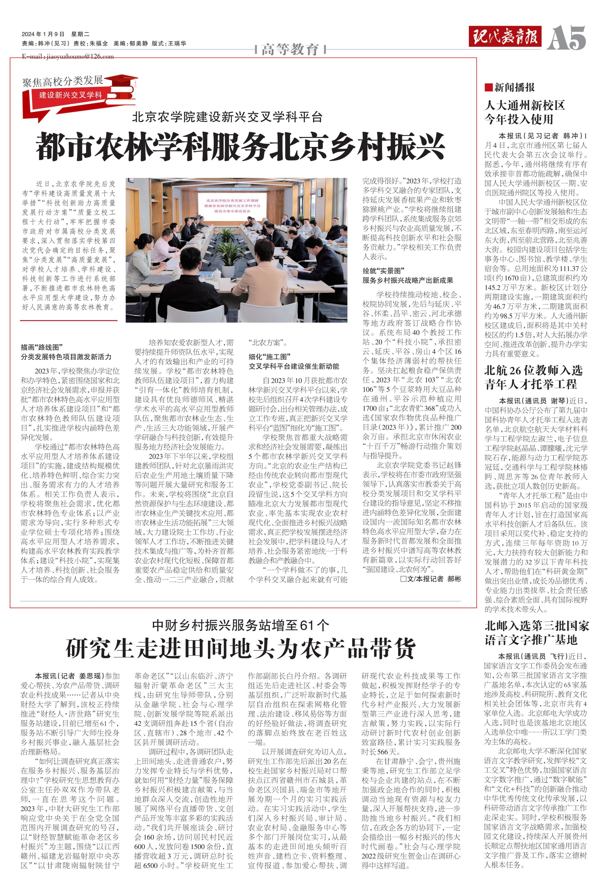 学校聚焦首都重大战略需求和经济社会发展需要,凝练出5个都市农林学新兴交叉学科方向。“北京的农业生产结构已经由传统农业转向都市型现代农业”,学校党委副书记、院长段留生说,这5个交叉学科方向瞄准北京大力发展都市型现代农业、率先基本实现农业农村现代化、全面推进乡村振兴战略需求,真正把学校发展摆进经济社会发展中,把学科建设与人才培养、社会服务紧密地统一于科教融合和产教融合中。