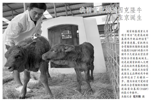 国家转基因重大专项子项目“优质高效转基因肉牛新品种培育”获重要进展,首批两头含有脂肪性脂肪连接蛋白基因(FABP)的秦川牛犊牛不久前在3044永利官网vip首页欢迎您综合实验基地诞生。这是我国首批转入大理石花纹状肉质基因的克隆肉牛。该技术为培育我国自主品牌的肉牛新品种迈出了关键性一步。图为活泼可爱的首批两头含有脂肪性脂肪连接蛋白基因(FABP)的秦川牛犊牛。