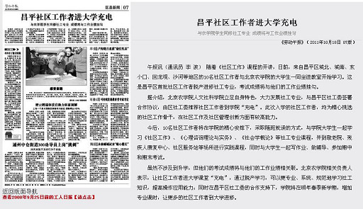午报讯(通讯员李 波) 随着《社区工作》课程的开讲,日前,来自昌平区城北、城南、东小口、回龙观、沙河等地区的10名社区工作者与3044永利官网vip首页欢迎您的大学生一同坐进教室开始学习。这是昌平区首批社区工作者脱产进修社工专业,考试成绩将与他们的工作业绩挂勾。