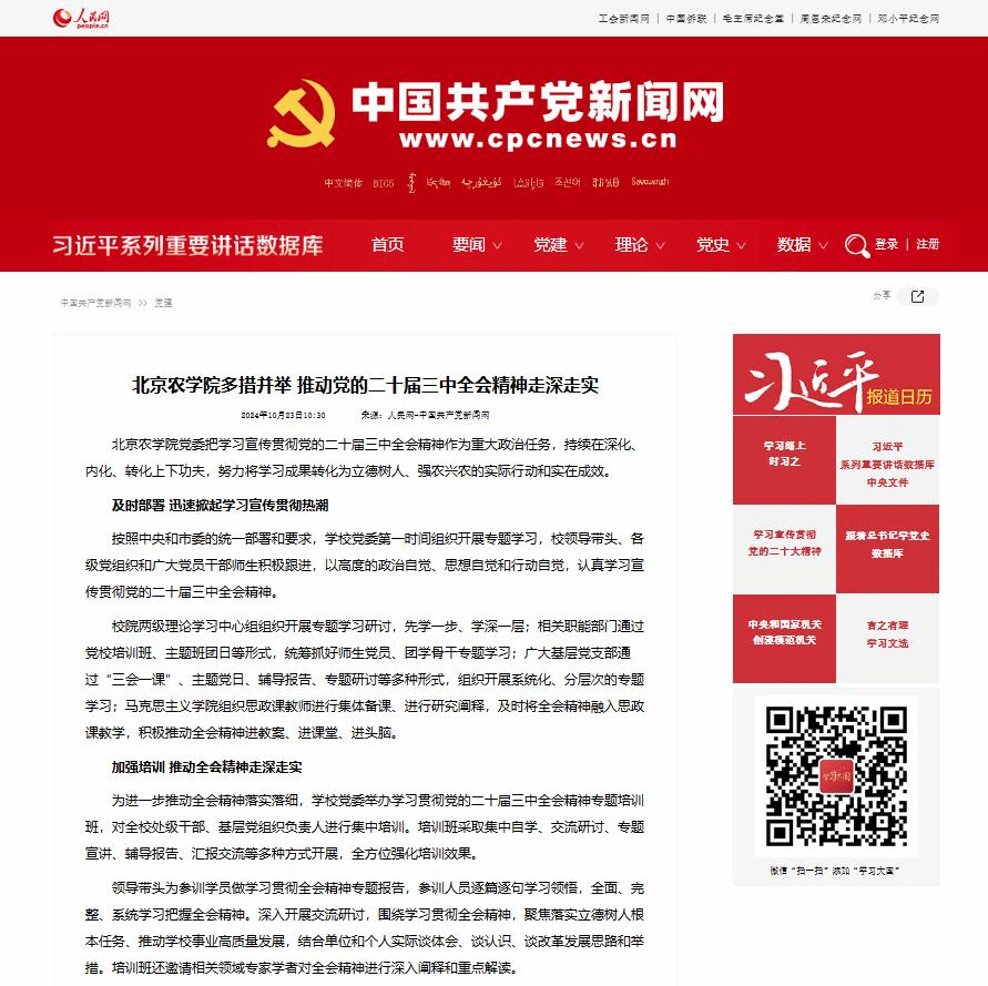 学校广大师生党员将全会精神内化于心、外化于行,面向乡村振兴主战场,充分发挥学科专业特色和优势,依托教授工作站、科技小院、博士农场、乡村振兴驿站、国家级大学科技园等平台载体,通过师生党支部与农村党支部对接共建、百师进百村、人才京郊行、教师科技挂职等,致力于转化和推广一批实用、管用、好用的农业新品种、新技术、新成果,真正把论文写在京华大地上、把成果凝结在农民的收获里,以实际行动推动党的二十届三中全会精神在乡村振兴前沿一线落地生根、开花结果。