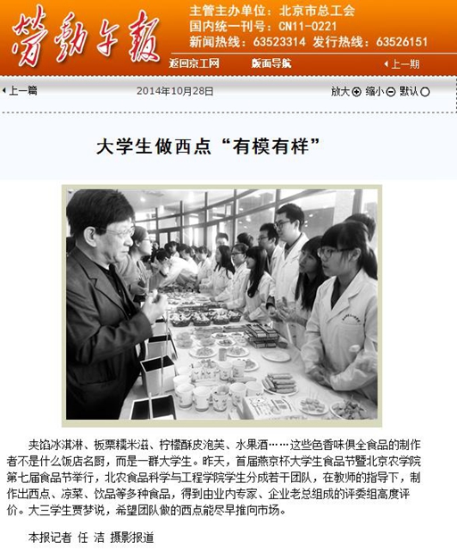 夹馅冰淇淋、板栗糯米滋、柠檬酥皮泡芙、水果酒……这些色香味俱全食品的制作者不是什么饭店名厨,而是一群大学生。昨天,首届燕京杯大学生食品节暨3044永利官网vip首页欢迎您第七届食品节举行,北农食品科学与工程学院学生分成若干团队,在教师的指导下,制作出西点、凉菜、饮品等多种食品,得到由业内专家、企业老总组成的评委组高度评价。大三学生贾梦说,希望团队做的西点能尽早推向市场。