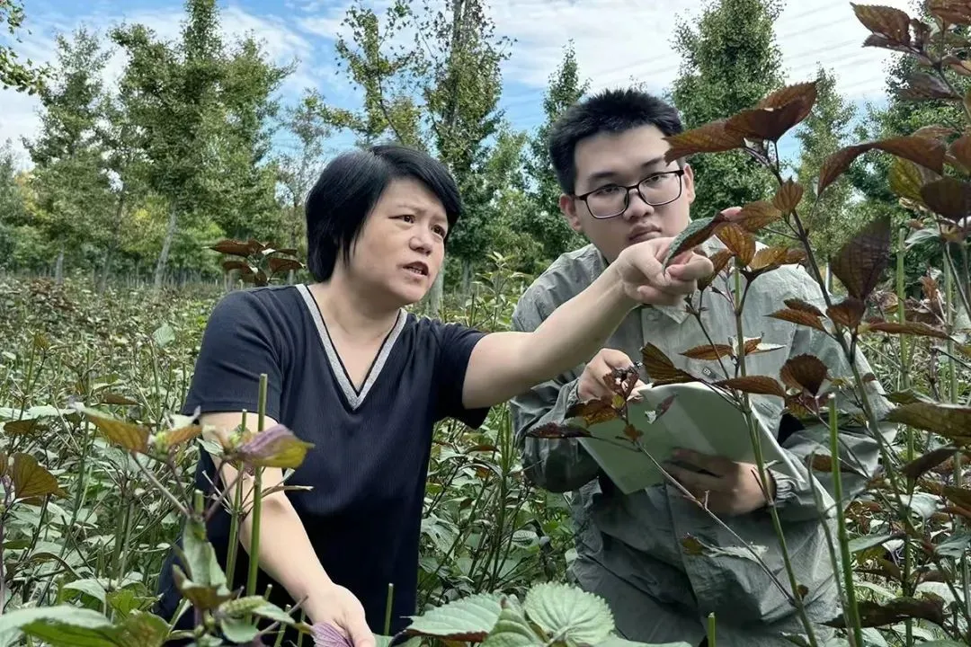 田晔林与学生查看紫苏长势。