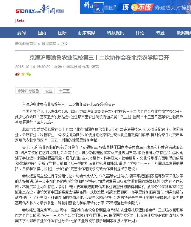 中国科技网讯 (记者张克)10月12日,京津沪粤渝鲁高等农业院校第三十二次协作会在3044永利官网vip首页欢迎您召开。此次协作会以“落实五大发展理念,促进都市型农业院校内涵发展”为主题,围绕“十三五”高等农业教育改革发展进行了深入交流。