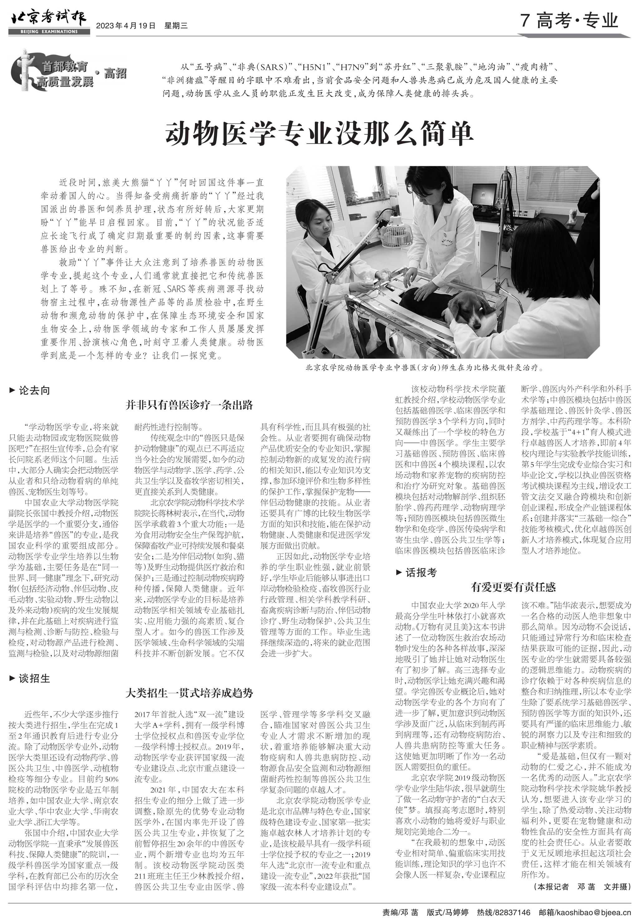 “学动物医学专业,将来就只能去动物园或宠物医院做兽医吧?”在招生宣传季,总会有家长问院系老师这个问题。生活中,大部分人确实会把动物医学从业者和只给动物看病的单纯兽医、宠物医生划等号。