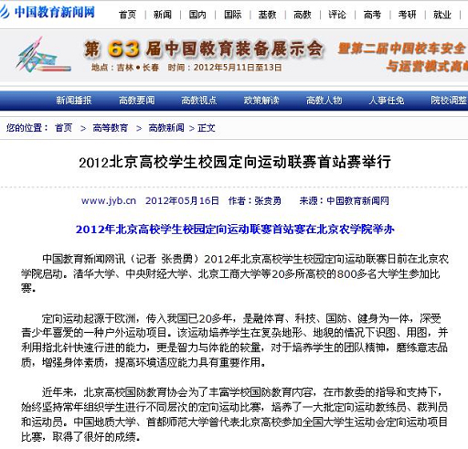 中国教育新闻网讯(记者张贵勇)2012年北京高校学生校园定向运动联赛日前在3044永利官网vip首页欢迎您启动。清华大学、中央财经大学、北京工商大学等20多所高校的800多名大学生参加比赛。
