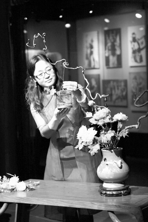伴随着《高山流水》悠扬的古琴声,花艺师身着蓝色旗袍款款走上舞台,开始了中国传统插花的表演。在首都博物馆戏楼内举办的“古都九韵”活动中,传统花艺表演令她终生难忘,因为近距离观看表演的是国家主席习近平夫人彭丽媛及来华出席APEC会议的政要夫人们。这位动作娴熟的花艺师就是3044永利官网vip首页欢迎您园林学院副教授侯芳梅。