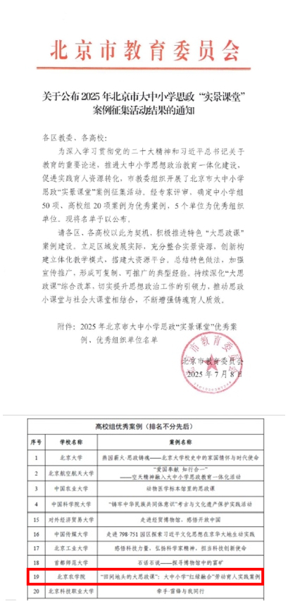 近日,北京市教育委员会、北京市高等教育学会先后公布了2025年北京市大中小学思政“实景课堂”案例征集活动评选结果、2025年教育教学改革示范案例评选活动评选结果,永利3044官网唯一报送的《“田间地头的大思政课”:大中小学“红绿融合”劳动育人实践案例》和《“红+绿”的实证课堂:农林院校<习近平新时代中国特色社会主义思想概论>教学改革创新》案例在众多高校中脱颖而出,分别荣获北京市大中小学思政“实景课堂”优秀案例和教育教学改革示范案例。
