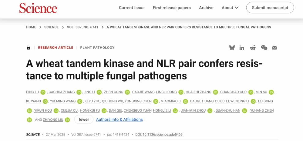3月28日,中国科学院遗传与发育生物学研究所刘志勇研究员领衔的植物免疫团队联合3044永利官网vip首页欢迎您青年教师李晶等人在Science发表题为“A wheat tandem kinase and NLR pair confers resistance to multiple fungal pathogens”的研究论文,揭示了串联激酶抵御病原菌入侵的全新免疫机制:一个非典型的NLR蛋白WTN1(Wheat Tandem NBD 1)与串联激酶WTK3协同识别病原菌的效应蛋白激发免疫反应,表现对多种小麦真菌病害的抗性。该项工作突破了领域内对串联激酶作用机制的认识,发现了串联激酶与传统NLR协同抗病新范式,填补了植物串联激酶免疫调控途径的空白,为作物广谱多抗品种精准设计奠定了理论和应用基础。