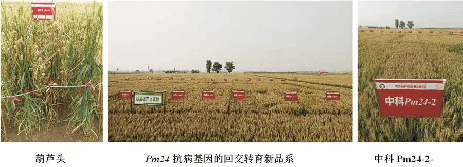 研究团队通过植物免疫学、生化实验、电生理实验和进化分析等多种方法,发现小麦中的WTK3和WTN1基因在进化过程中形成了紧密的合作关系,共同帮助小麦抵抗病原菌的入侵。具体来说,WTK3有两个重要的“功能模块”,第一模块由假激酶片段(PKF)和WTK3的第一个激酶(Kin I)结构域组成,它们的任务是识别病原菌释放的“攻击信号”-效应蛋白;第二个模块为WTK3的第二个激酶(Kin II)结构域,它的作用是衔接NLR蛋白WTN1,形成一个“防御小分队”。当感知到病原菌入侵后,WTK3-WTN1复合物迅速被激活,形成离子通道促进钙离子(Ca2+)内流,从而激活超敏反应和细胞程序化死亡。进化分析表明WTK3和WTN1在早熟禾亚科进化过程中协同进化。值得注意的是,前期研究表明Pm24(WTK3)基因为我国小麦地方品种所特有的基因资源,课题组经过多年的回交转育,已将Pm24基因导入到多个高产小麦底盘品种(图2),创制的抗病新种质已无偿发放给国内多家单位进行抗病育种利用,这些研究成果有望解决我国小麦主产区缺乏广谱抗白粉病基因资源的问题,同时为防控麦瘟病提前建立潜在的遗传屏障,为我国农业可持续发展和产业升级提供重要的理论和技术支持。
