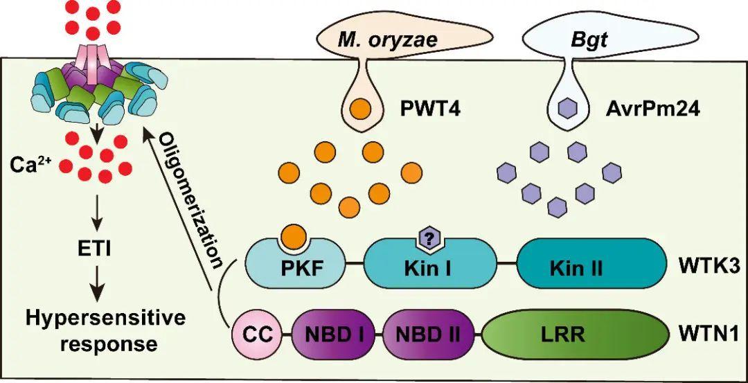 团队通过筛选抗白粉病基因Pm24(WTK3)的EMS诱变感病突变体,鉴定到一个WTK3抗病通路的关键因子WTN1,WTN1是与WTK3紧密连锁的非典型NLR蛋白。遗传学分析结果表明,WTN1的存在是WTK3免疫小麦白粉病的关键,WTK3-WTN1通过感受器-编码器(sensor-executor)的协同作用模式激活免疫反应。令人惊喜的是WTK3不仅抗小麦白粉病,并且能够识别麦瘟病菌效应因子PWT4并触发免疫反应,具有潜在的抗麦瘟病能力。