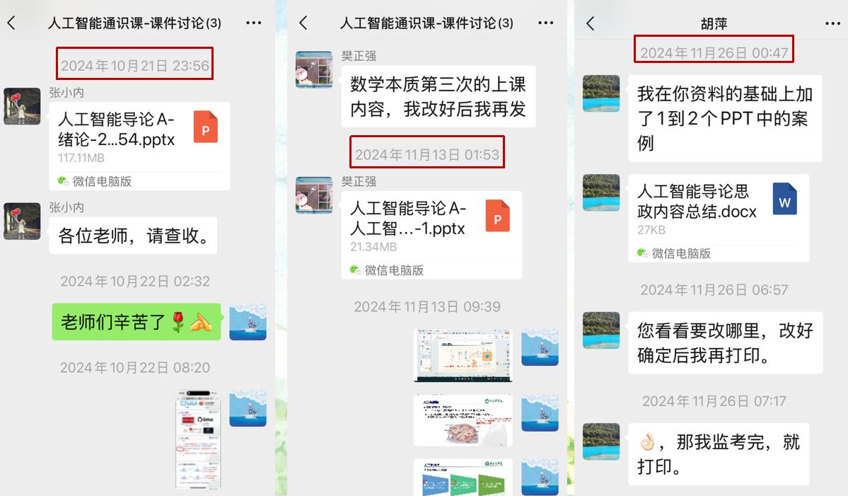 使命在肩,面对极限时间挑战,团队顶住压力,以高频高效教研奋力突围。“白+黑”“5+2”连轴转。刚休完产假的二胎妈妈李晓华副教授作为课程负责人带队冲锋,跑在第一线;子夜时分,张小内老师发来修改后的课件;凌晨两点,樊正强老师完成“数学本质”章节的第三次打磨;胡萍老师深夜分享新挖掘的思政案例……每一条消息、每一次文件传输,都是协作的见证,也诠释着团队炽热的担当。