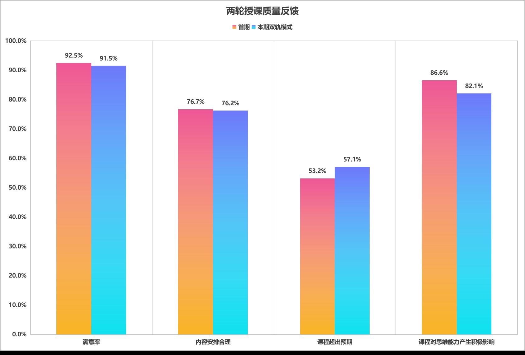 团队的拼搏推动课程高质量落地,两学期覆盖37个专业、1700多名学生。学生满意度连续两轮都超过了90%,近八成的学生认为内容安排合理,超半数的学生表示课程超出预期,更有八成以上学生反馈课程显著提升他们的思维能力。