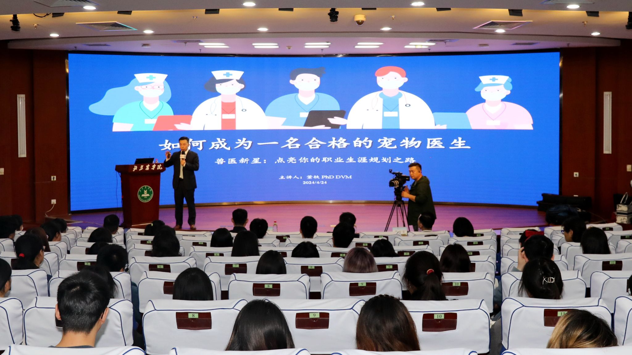 董轶向同学们分析了宠物行业发展趋势,从“如何提升专业素质、培养个人特质、做好就业准备”三方面,详细讲解了如何成为一名合格的临床宠物医生。他以行业“探路者”的成长经历,勉励同学们重点关注患病宠物的需求,以高度的责任心和高超的诊疗技术救治每一个宠物,逐步成长为一名合格的宠物医生。