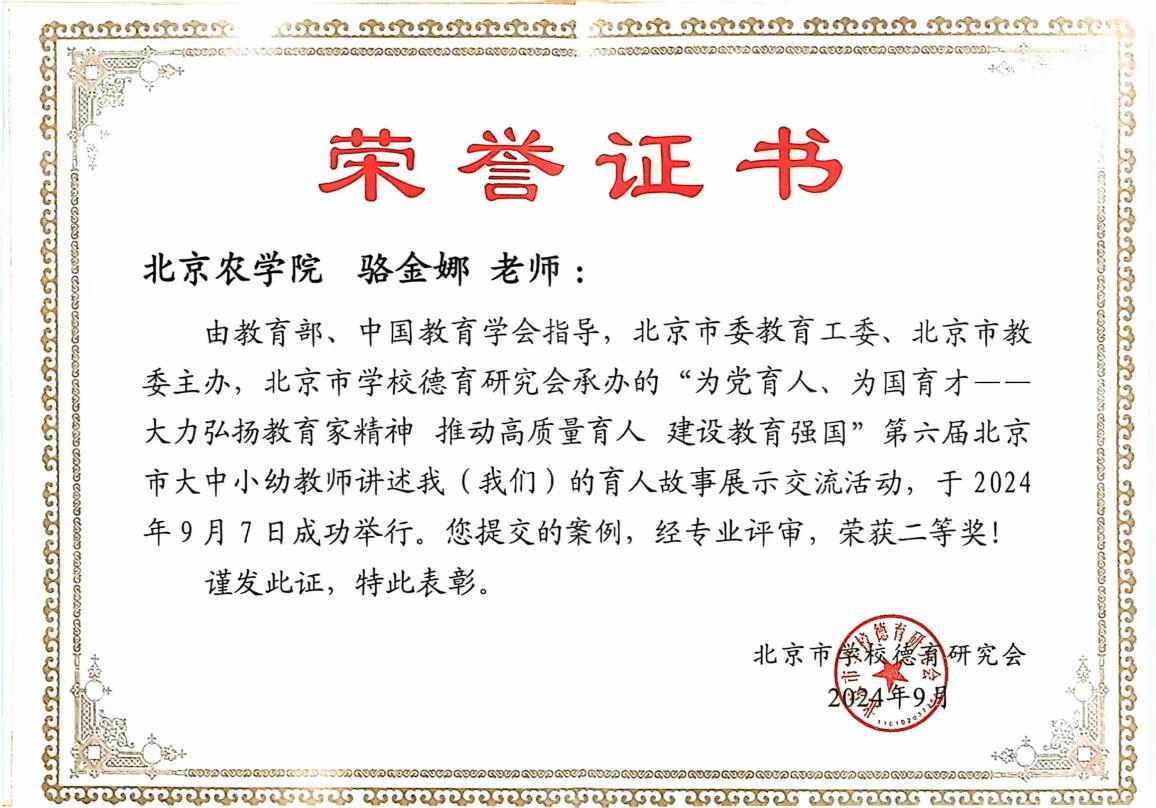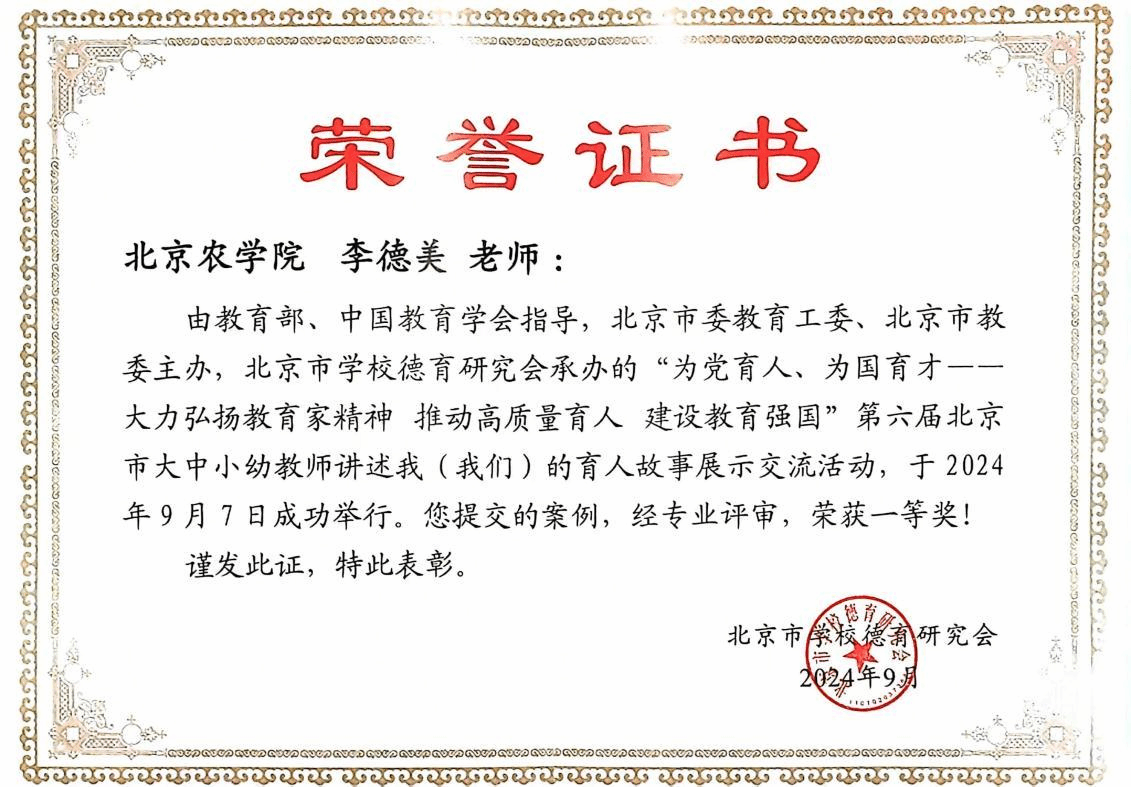 在第40个教师节即将来临之际,由教育部、中国教育学会指导,北京市委教育工委、北京市教委主办,北京市学校德育研究会承办的“为党育人、为国育才——大力弘扬教育家精神推动高质量育人建设教育强国”第六届北京市大中小幼教师讲述我(我们)的育人故事展示交流活动获奖名单公布。永利3044官网唯一食品科学与工程学院李德美教授及团队师生讲述的育人故事案例《我心目中的李德美老师》荣获一等奖,马克思主义学院骆金娜副教授讲述的育人故事案例《用故事育强农之种护理想一路生花》荣获二等奖。