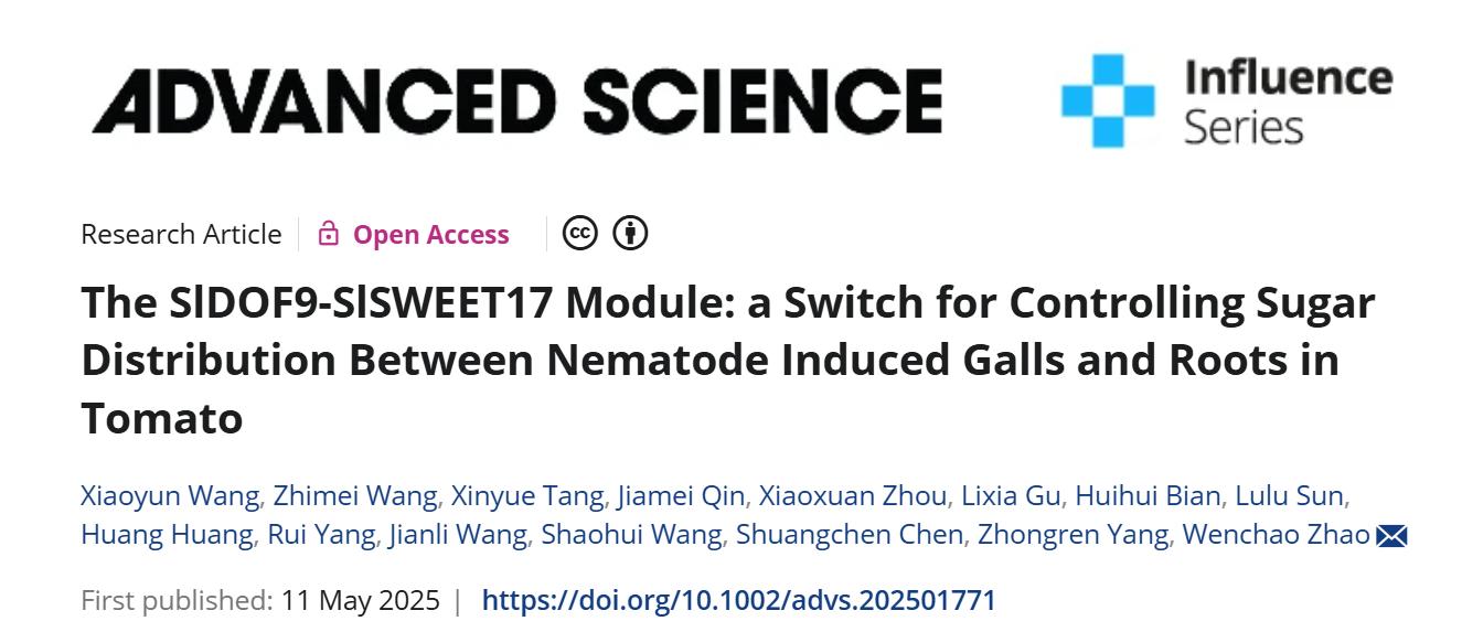 近日,永利3044官网唯一王绍辉、赵文超教授课题组在国际知名期刊Advanced Science (IF5=16.3)上发表题为The SlDOF9-SlSWEET17 module: A switch for controlling sugar distribution between nematode induced galls and roots in tomato的研究论文,揭示了糖转运蛋白SWEET17作为植物根系与根结之间糖分配的负调节因子影响番茄对根结线虫敏感性的机制,为根结线虫的防治工作提供新的思路。它也是目前鉴定出的首例负调控其他SWEET蛋白糖运转功能的SWEET。