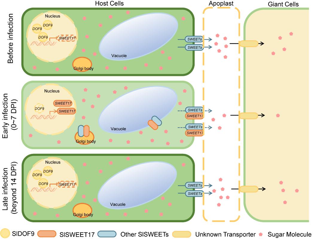 研究人员提出了SlDOF9-SlSWEET17模块作为“分子开关”在根结线虫侵染全过程中的动态调控规律,分为三个关键阶段:正常条件下:SlDOF9与SlSWEET17维持基础表达水平。此时,SlDOF9通过结合SlSWEET17启动子并抑制其表达,允许其他高活性糖转运蛋白(如SlSWEET1c、SlSWEET1e 等)正常向根部质外体运输糖分,保障植物自身生长所需的营养分配平衡,同时避免过度防御消耗自身能量;侵染早期(0-7天):当线虫侵入根系并开始诱导根结形成时,SlDOF9表达量迅速下调,解除对SlSWEET17的转录抑制。此时SlSWEET17蛋白通过与其他高活性SWEET蛋白结合,形成异源二聚体,降低后者的糖转运能力。这一 “蛋白互作刹车”机制可有效减少糖分向根结富集,通过 “饥饿战术”抑制线虫幼虫发育,为植物启动免疫反应争取时间;侵染后期(14天以后):随着根结线虫进入寄生稳态阶段,此时SlDOF9的表达量回升,重新抑制SlSWEET17转录,释放被封锁的高活性SWEET蛋白。尽管这为线虫提供了部分糖分营养,但避免了根系长期糖剥夺导致的发育障碍,体现了植物在抵御病原与维持自身生存之间的“策略性妥协”。