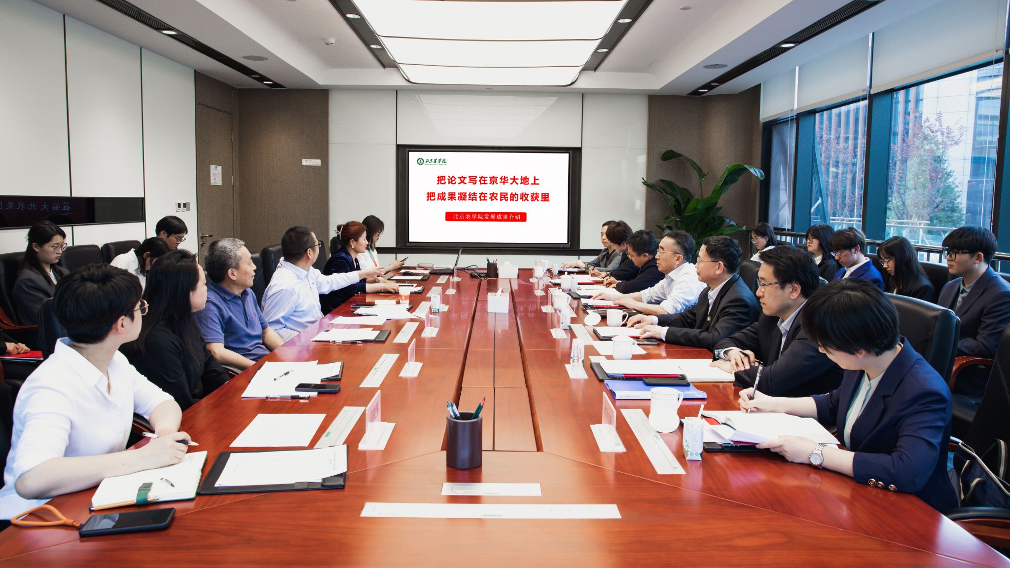 段留生介绍了学校基本情况,重点介绍了学校以高质量党建引领高质量发展、大力培养知农爱农新型人才、服务乡村振兴等方面取得的成效以及学校2024届毕业生整体情况。他指出,学校落实立德树人根本任务,深化“三全育人”,推进“五育并举”,不断提升知农爱农新型人才培养质量。希望以此次访企拓岗为契机,进一步了解企业用人需求,发掘岗位资源,构建校企常态化交流机制,推动“育人”“用才”协同共赢,为北京全面推进乡村振兴和率先基本实现农业农村现代化贡献力量。