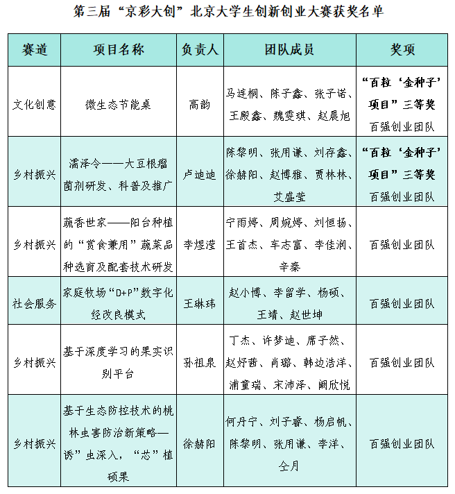 近日,北京市教育委员会、北京市人力资源和社会保障局、北京市发展和改革委员会联合公布了第三届“京彩大创”北京大学生创新创业大赛获奖名单,永利3044官网唯一6支学生团队荣获北京市“百强创业团队”称号,其中“微生态节能桌”“濡泽令——大豆根瘤菌剂研发、科普及推广”2支团队晋级决赛并获得三等奖,被列为北京大学生创新创业“百粒‘金种子’项目”,学校荣获优秀组织奖。