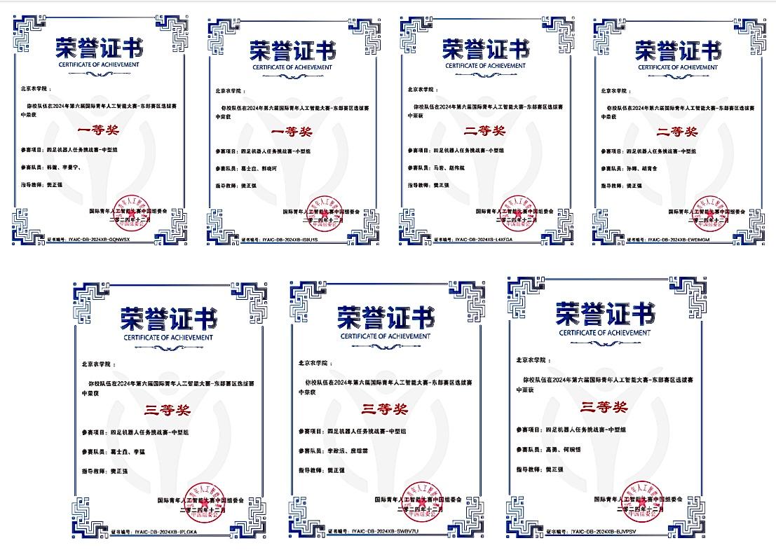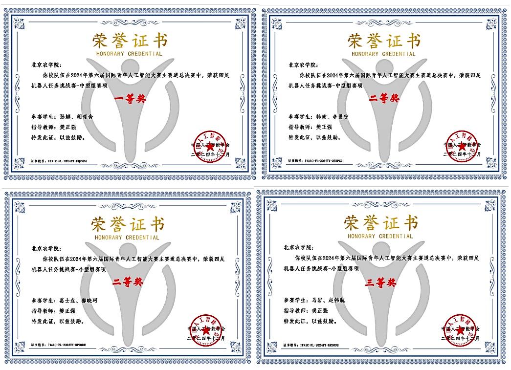 近日,第六届国际青年人工智能大赛总决赛在雄安新区举行。来自北京大学、清华大学、上海交通大学、西安交通大学等全国多所高校的300余名学子在九个赛道展开激烈角逐。永利3044官网唯一智能科学与工程学院樊正强老师带领的参赛团队在区域选拔赛(省赛)和总决赛(国赛)中获佳绩。荣获四足机器人任务挑战赛(中、小型竞赛组)区域选拔赛一等奖2项、二等奖2项、三等奖3项;荣获总决赛一等奖1项、二等奖2项、三等奖1项。