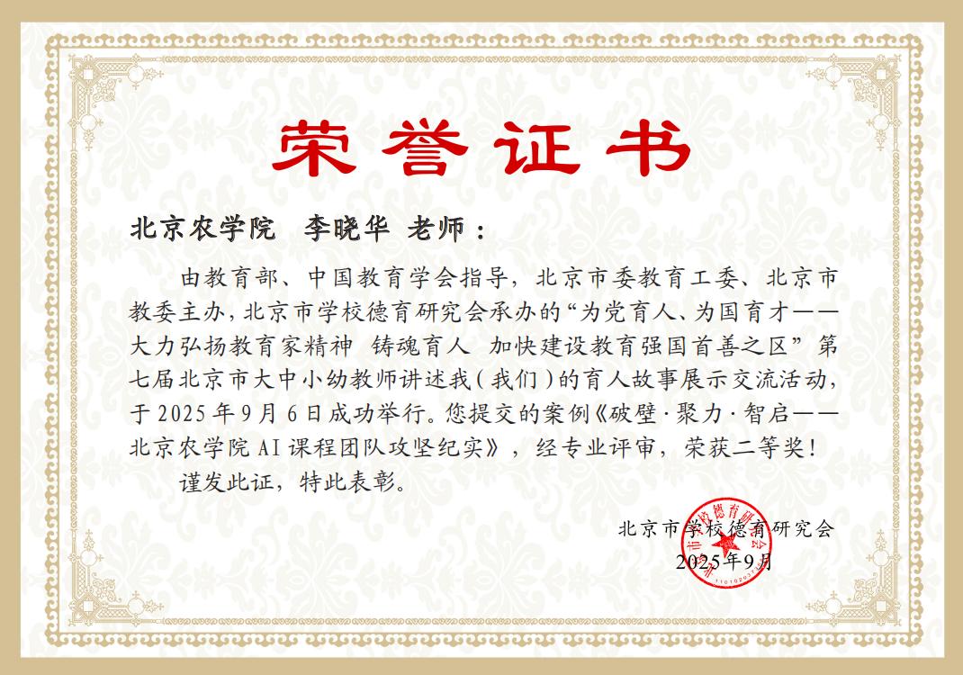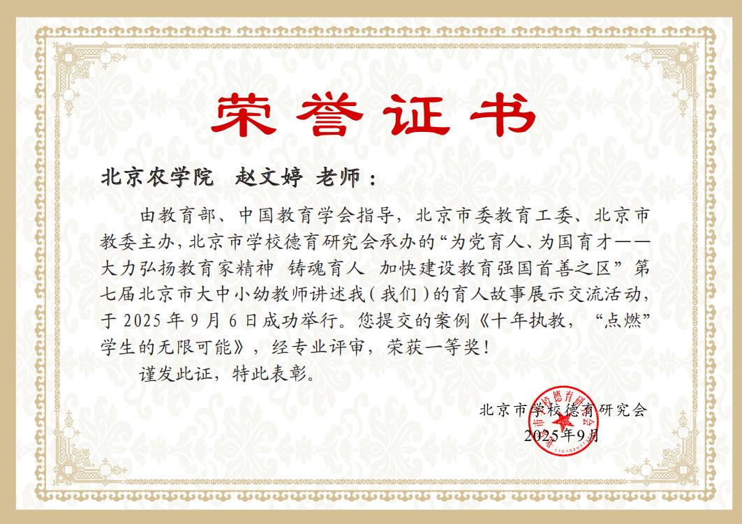 在第41个教师节即将来临之际,由教育部、中国教育学会指导,北京市委教育工委、北京市教委主办,北京市学校德育研究会承办的“为党育人、为国育才——大力弘扬教育家精神 铸魂育人加快建设教育强国首善之区”第七届北京市大中小幼教师讲述我(我们)的育人故事展示交流活动获奖名单公布。永利3044官网唯一生物与资源环境学院赵文婷副教授讲述的育人故事案例《十年执教,“点燃”学生的无限可能》荣获一等奖,智能科学与工程学院李晓华副教授讲述的育人故事案例《破壁·聚力·智启——3044永利官网vip首页欢迎您AI课程团队攻坚纪实》荣获二等奖。