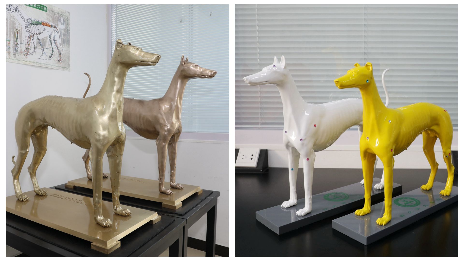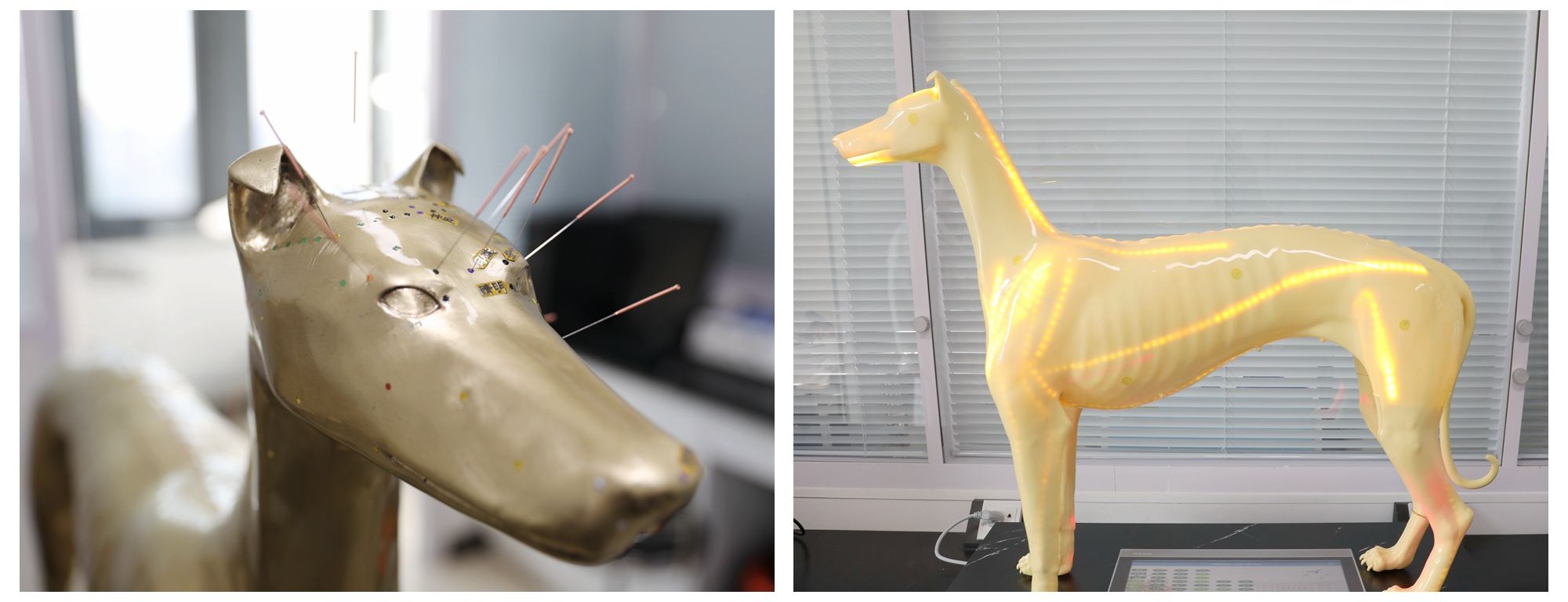 有了学校“火花行动”的支持,姜代勋老师开始逐步推进“针灸铜犬”及智能经络腧穴模型犬的研制工作。经过两年多的研发设计、数次调整,姜代勋及团队成员完成了1套雌雄犬腧穴定位练习模型、1套雌雄针灸铜犬和3套犬智能经络腧穴模型的制作。“我们研发的针灸铜犬体表有百余处用于腧穴快速准确定位的标志和近700个穴孔,学生可以根据这些标志揣摩腧穴位置,练习针刺操作。同时,我们也用不同颜色区分不同经脉的腧穴,帮助学生通过颜色了解经脉循行和腧穴分布的基本规律。”说起自己的“作品”,姜代勋难掩激动和自豪。