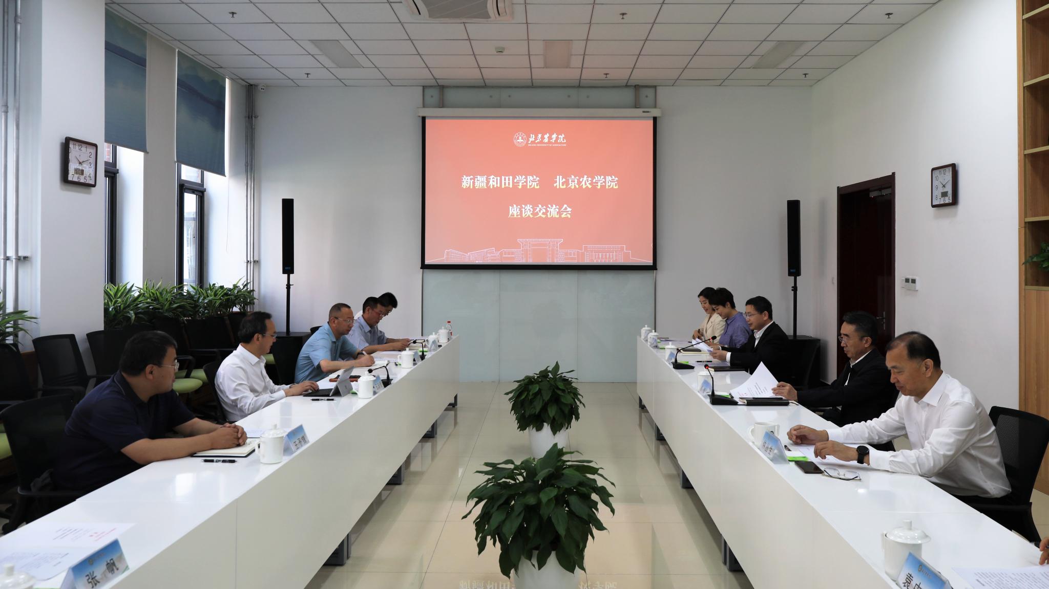 段留生介绍了学校的历史沿革、办学特色以及在学科建设、人才培养、科学研究等方面取得的成效。他指出,学校始终坚持以服务国家战略和首都发展为己任,将充分发挥自身学科优势,进一步加强合作平台建设,深化合作交流机制,在人才培养、科技创新、社会服务、师资队伍建设等方面不断拓展合作的广度、深度,建立常态化交流机制,为推动新疆和田学院高质量发展、推进北京教育援疆工作走深走实贡献“北农力量”。