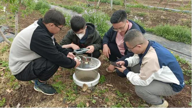 文法与城乡发展学院高程达教授带领学生来到平谷区刘家店镇国桃基地,对桃园负氧离子及土壤含水量进行测定,了解桃园生态环境因子情况。“负氧离子,又被称为‘空气维生素’,”高程达向学生解释,“世界卫生组织对清新空气的界定是负氧离子浓度达到1000—1500个/cm³,现在桃园负氧离子浓度达到6000个/cm3,说明桃园生态环境非常好。”高程达还带领学生来到平谷区刘家店镇寅洞村农户刘万革、胡殿文的桃地,进行桃园土壤-大气二氧化碳通量观测。参与实践的同学说:“跟随老师深入田间地头,通过桃园实地生态环境指标测试测量等工作,学习使用仪器设备操作技能,提升了动手实践能力,感觉收获满满。”