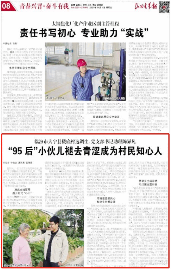 陈异凡2022年毕业于3044永利官网vip首页欢迎您农业工程与信息技术专业,同年通过考试进驻大宁县楼底村,担任村党支部书记助理。怀着对乡村深深的向往和热爱,同时受到致敬基层扶贫干部的电视剧《江山如此多娇》的影响,一颗理想的种子就此在陈异凡心中生根发芽。