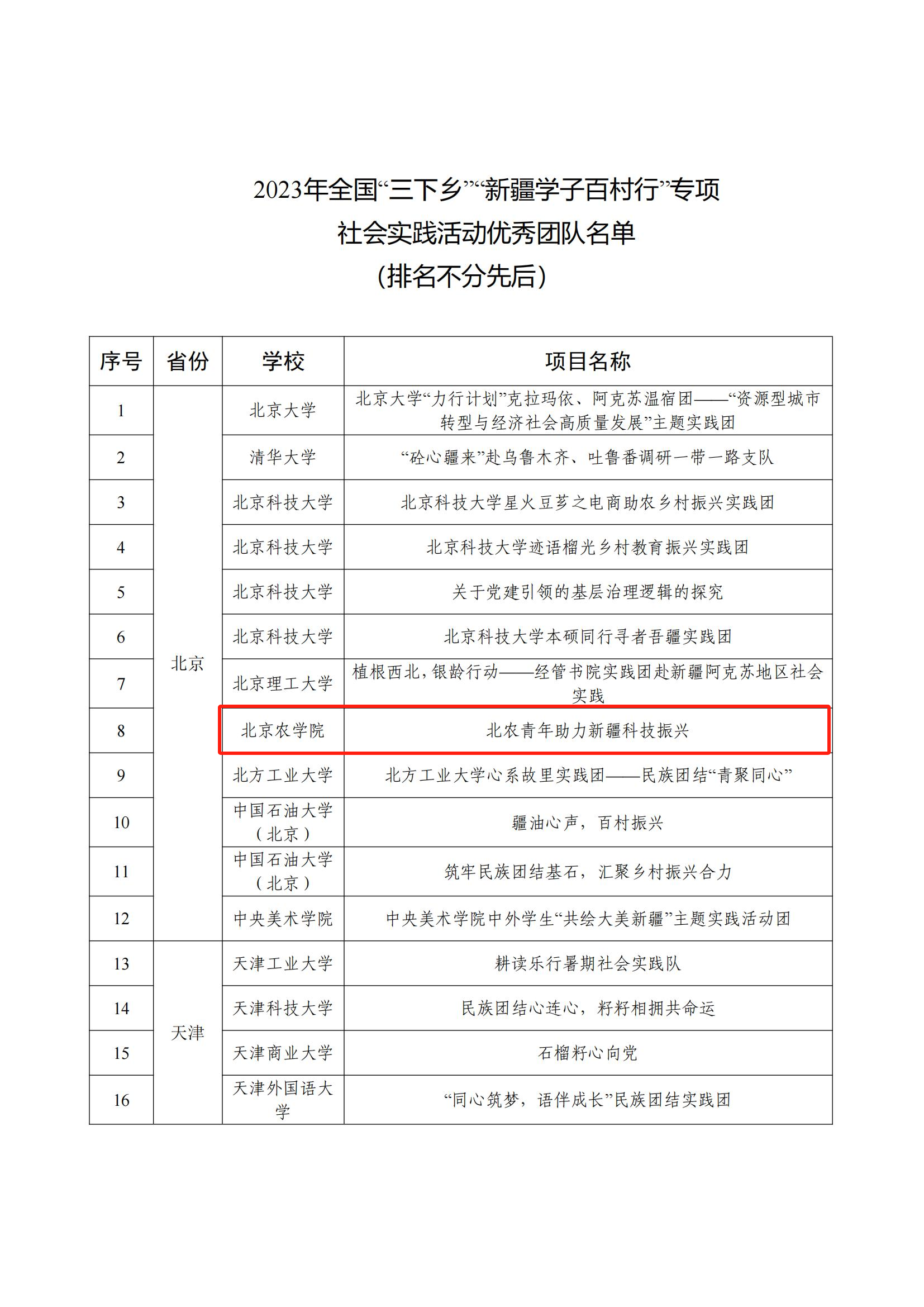 11月1日,共青团新疆维吾尔自治区委公布了2023年全国“三下乡”“新疆学子百村行”专项社会实践活动优秀团队名单,永利3044官网唯一生物与资源环境学院“北农青年助力新疆科技振兴”实践团从全国127所高校的230支队伍中脱颖而出,获评优秀团队。