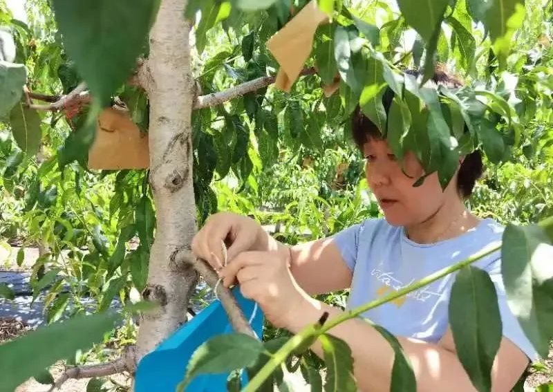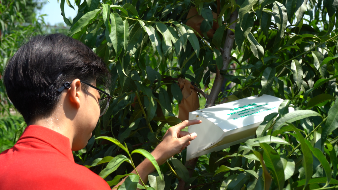 实践团成员在杜艳丽老师的指导下,在桃园悬挂黄板和蓝板,用于诱杀桃树主要害虫——桃蚜和蓟马;悬挂梨小食心虫和桃蛀螟性诱芯和诱捕器,诱杀这两种害虫的同时开展病虫害发生规律调查。