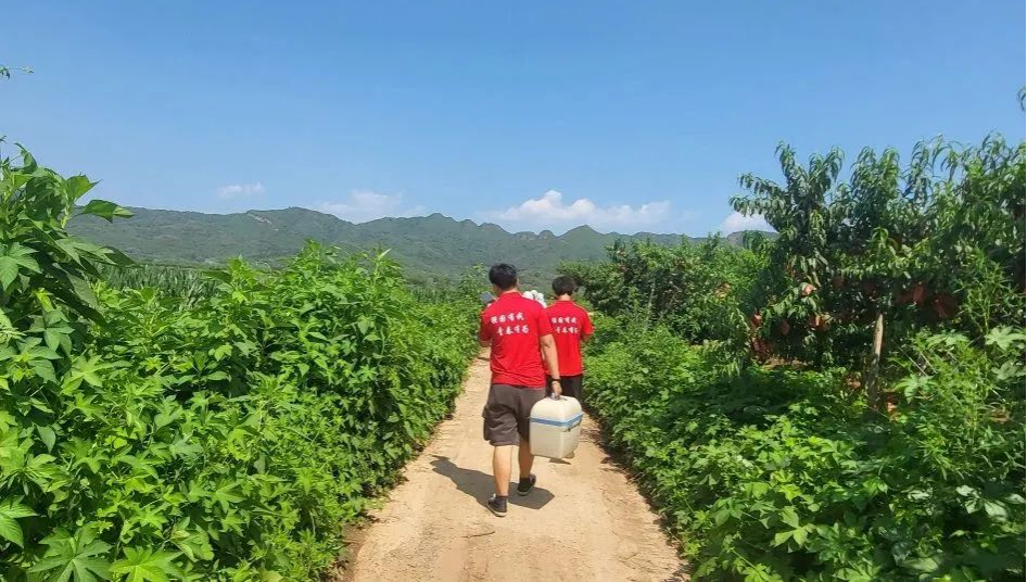 在刘悦萍老师和常明明老师的指导下,实践团队来到平谷区国桃种质基地和果农家的桃园开展采样工作。团队成员分工协作、不畏酷暑,采集土壤样本,剪取桃根、桃叶、桃枝,摘取病害桃果,为后续开展相关实验和科学研究收集材料。