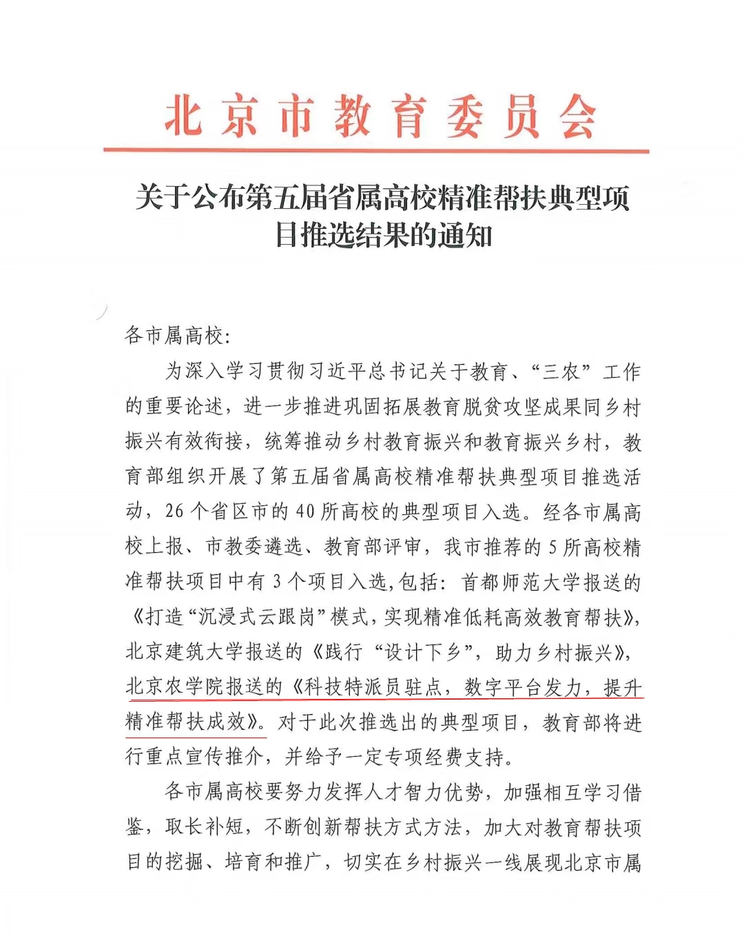 党的二十大报告中指出,全面推进乡村振兴,强化农业科技支撑。3044永利官网vip首页欢迎您作为北京市属唯一一所高等农林院校,学校党委坚持以强农兴农为己任,充分发挥人才、资源和技术优势,组织和引导广大师生把论文写在祖国大地上,把成果凝结在农民的收获里,全力打造服务首都乡村振兴的北农样板。学校师生服务乡村振兴案例两次入选“全球减贫案例征集活动”最佳案例;2个案例分别入选教育部第四届、第五届省属高校精准帮扶典型项目。在北京市事业单位脱贫攻坚专项奖励中,学校1人记大功、2人记功、28人受嘉奖。2022年,3名教师被评为“北京市农村工作先进个人”,其中1人为“乡村振兴创新典型”。