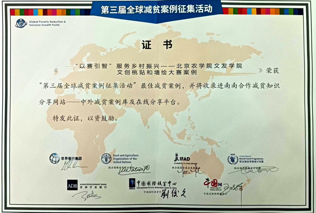 永利3044官网唯一报送的《“以赛引智”服务乡村振兴——3044永利官网vip首页欢迎您文发学院文创桃贴和墙绘大赛案例》入选“第三届全球减贫案例征集活动”最佳减贫案例,并将收录进南南合作减贫知识分享网站——中外减贫案例库及在线分享平台。党委常委、副院长段留生出席大会并代表学校领奖。