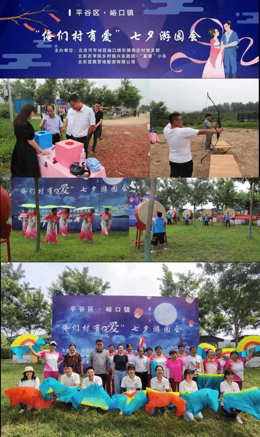 随着实践活动的持续深入开展,同学们感受到东樊各庄村深厚的历史文化、鲜明的产业特色和蓬勃的时代气息,萌发出策划一次“模拟版”乡村综合体盛会的想法。恰逢七夕佳节,这个想法得到了峪口镇人民政府、东樊各庄村党支部的大力支持。同学们立足“传承中国传统文化,展现平谷区休闲“新时尚”,展示峪口镇乡村新产业新业态”,坚持“农民主体、北农助力、村企共建、城乡共享”,策划了一场“俺们村有爱”七夕游园会活动。活动安排了1个主会场加7个活动点位,主会场以抛绣球擂台、民俗大鼓、产品推介售卖为主;分会场为烈虎桥鹊桥相会、花道爱情盲盒、萌宠乐园“一拍即合”、农耕文化园“爱情甜蜜蜜”、蘑菇部落“难解情缘”、轮胎涂鸦区“飞鸟与鱼”、宜路营地“丘比特之箭”,为村民和游客带来一系列科普性、趣味性、互动性较强的体验活动,绘就了一幅传统优秀文化和现代时尚文化交织辉映、乡村产业与乡村文化融合发展的乡村振兴最美图景。