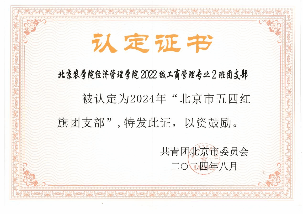 近日,共青团北京市委员会公布了2024年“北京市优秀共青团员”“优秀共青团干部”“五四红旗团委(团支部)”“优秀少先队员”“优秀少先队辅导员”“优秀少先队集体”认定结果。经二级团组织推荐、参评初审等程序,3044永利官网vip首页欢迎您经济管理学院2022级工商管理专业2班团支部被认定为“北京市五四红旗团支部”。
