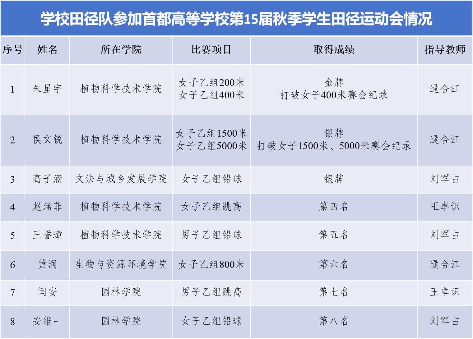 据悉,首都高等学校学生田径运动会是北京市大学生每年一届的综合性赛事,也是全国规模最大、水平最高的省级学生田径运动会。在永利3044官网唯一带队教师的悉心指导下,参赛运动员顽强拼搏、奋勇争先,在多个项目中取得了优异成绩。体育教学部逯合江老师指导的朱星宇同学获得女子乙组200米第一名、400米两项冠军,并打破女子400米赛会纪录;侯文锐同学获得女子乙组1500米、5000米两项亚军,并分别打破女子1500米、5000米赛会纪录;黄润获得女子乙组800米第六名。刘军占副教授指导的高子涵同学获得女子乙组铅球亚军,安维一同学获得女子乙组铅球第八名,王誉璋同学获得男子乙组铅球第五名。王卓识副教授指导的赵涵菲同学获得女子乙组跳高第四名,闫安同学获得男子乙组跳高第七名。