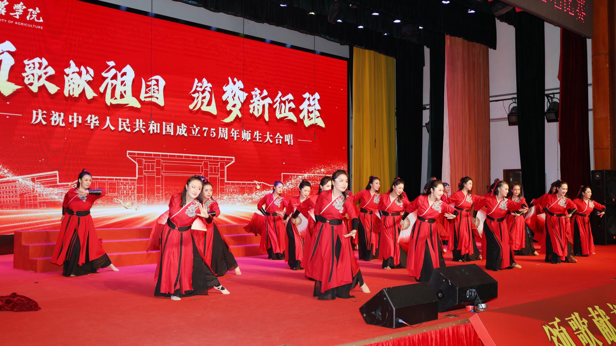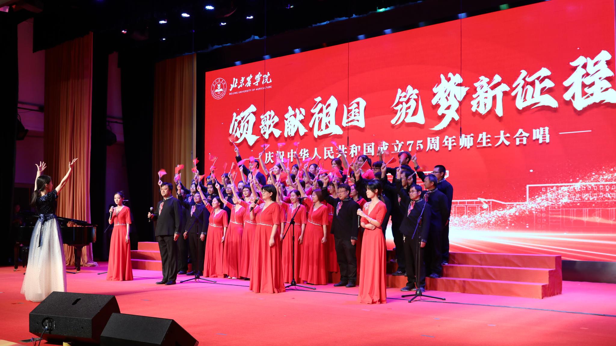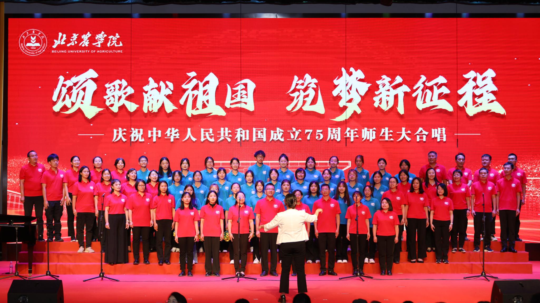 为迎接中华人民共和国成立75周年,大力弘扬爱国主义精神,强化强农兴农使命担当,9月25日下午,学校举办“颂歌献祖国 筑梦新征程”活动,全体校领导与师生共唱歌颂党、歌颂祖国、歌颂人民的经典歌曲和饱含强农兴农、爱校荣校之情的校歌《绿色的希望》。唱出北农人踔厉奋发、勇毅前行的精神风貌,抒发为建设教育强国、农业强国贡献北农力量的壮志豪情。